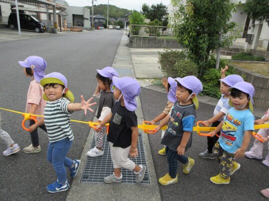 2歳児・あひる組と3歳児・うさぎ組が連れ立ってお散歩に出かけました。