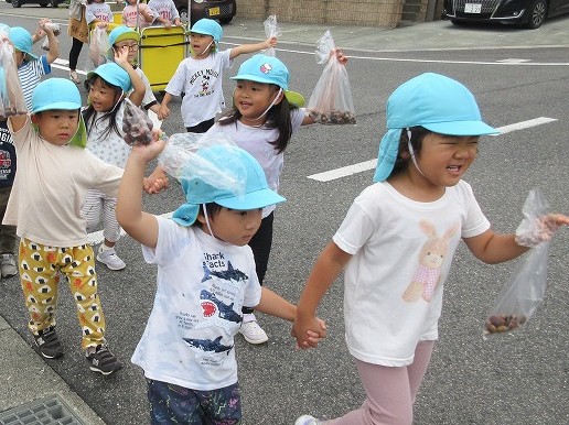 3歳児・うさぎ組のおともだちも、交差点では、しっかり手をあげて渡ることができました。