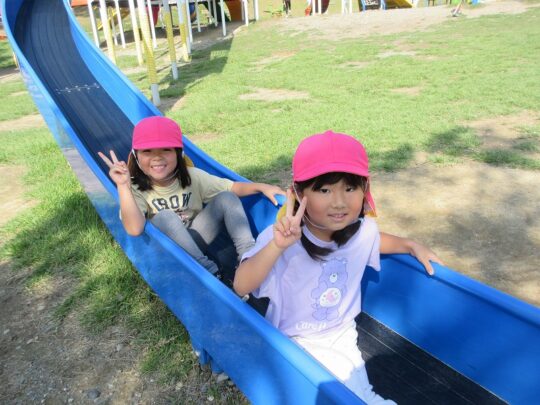 なが~いすべり台をお友だちとすべって、たのしい~!