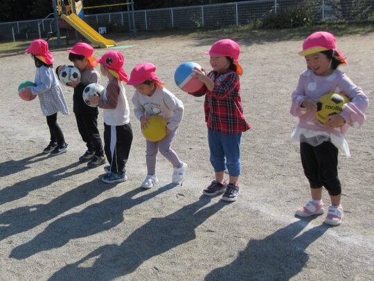 4歳児・ぱんだ組のおともだちは、大きいボールを投げてみよう。