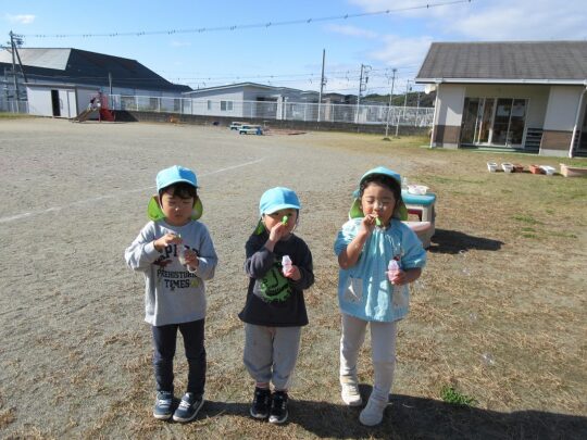3歳児・うさぎ組のお友だちが、しゃぼんだまを楽しんでいます。