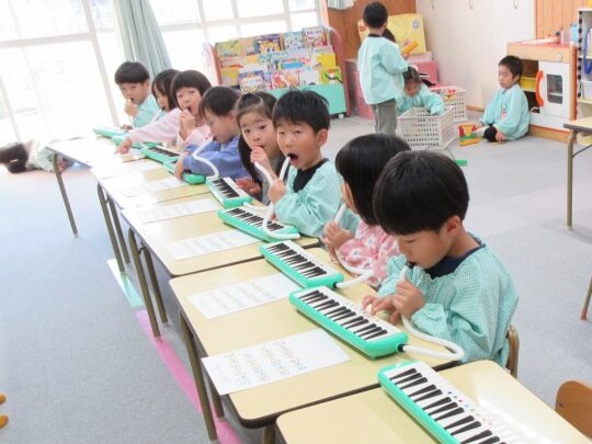 4歳児・ぱんだ組のお友だちが、発表会にむけて、鍵盤ハーモニカに取り組んでいます。