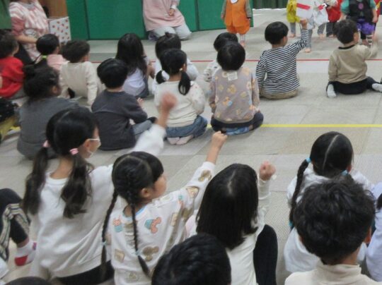 0.1歳児、ひよこ・りす組のステージをみんなで見ました。客席もいっしょに振りをつけて、盛り上がりました。
