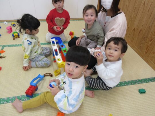 1歳児。りす組のおともだちが、ひとつのおもちゃをいっしょに使って、遊んでいます。