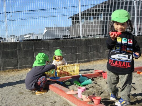 砂場でごちそうをつくっていたおともだちが、どうぞって差し出してくれました。