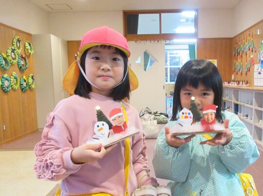 2025.12.25 きょうは クリスマス どのクラスも、園で作ったクリスマス製作の作品を持ち帰りました。 4歳児・パンダ組のおともだちの作品です。 ゆきだるまの丸は、はさみで頑張って切ったんだよね。 サンタさんのお顔は、だれかな?
