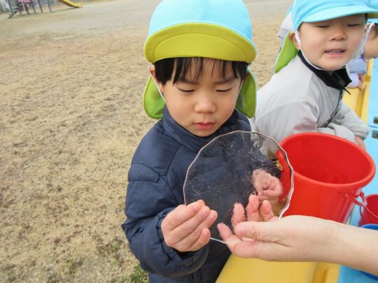 園庭に水を入れたバケツを置いて、氷をつくりました。