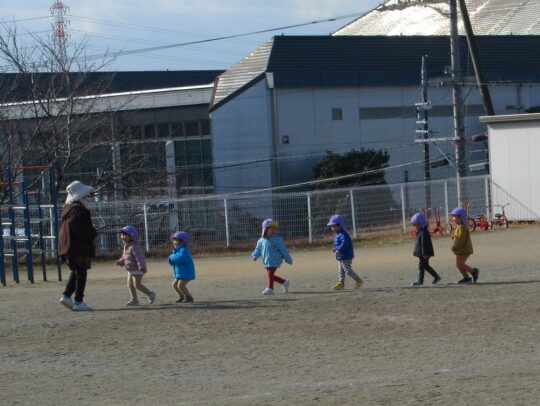 2歳児・あひる組のおともだちが、園庭をあるいています。
