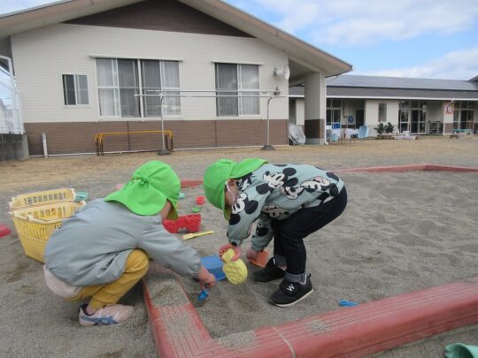 1歳児・りす組のおともだちが、砂場で遊んでいました。