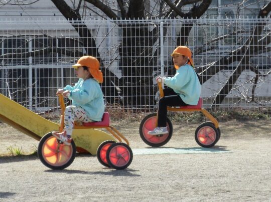5歳児・きりん組のおともだちが、三輪車ですいすい走っています。