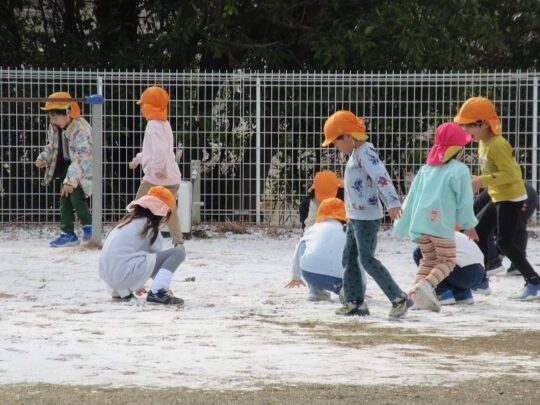 わずかに残った雪を丸めて、雪がっせんの準備中。