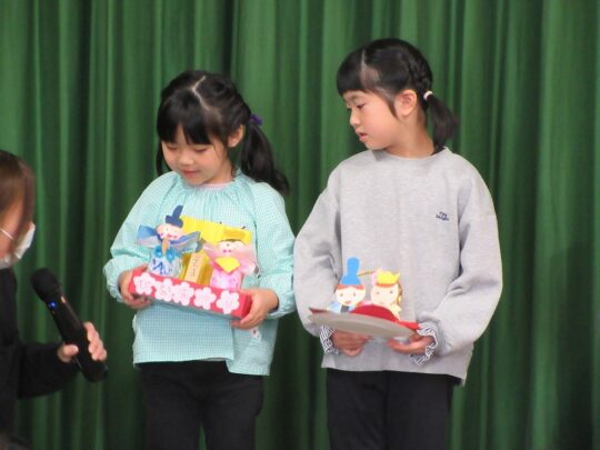 2026.03.3 ひなまつり会 ひな壇に並んでいるお人形のお名前がわかったよ。 しちょう、うだいじん、さだいじん、ごにんばやし、さんにんかんじょ、おだいりさま、おひなさま みんなのおひなさまも、紹介したんだよ。