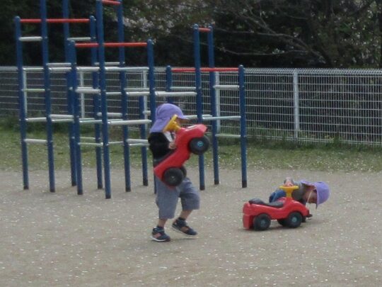 3歳児・うさぎ組のおともだち、足こぎカーをのぞき込んで、まるでメカニックのようです。