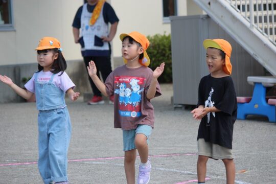 5歳児きりん組さんは、鼓笛の隊形変化の練習です。