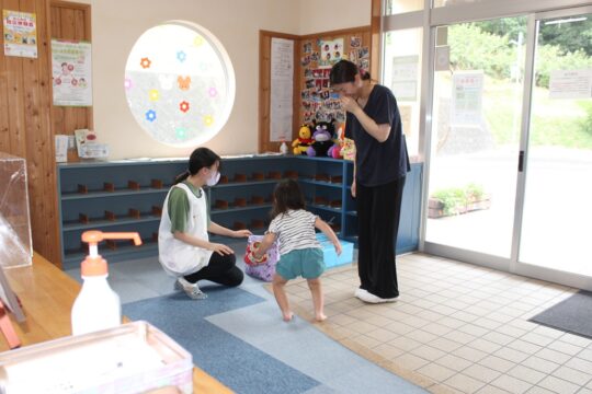 2025.09.11 保育園の一日は、朝のあいさつから 朝の7時を過ぎたころ、子どもたちの登園が始まります。 保護者のみなさんや子どもたちと交わす笑顔のあいさつ。 先生が、お家での様子をお聞きしてお子さんをお預りしています。
