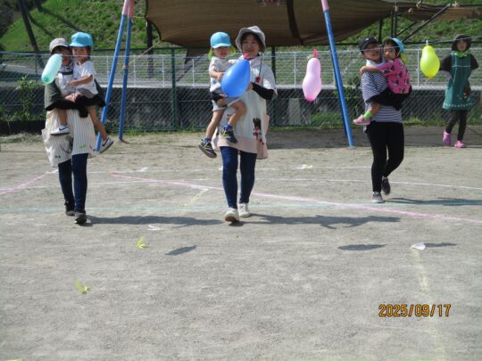 お家の人のかわりに先生たちに抱っこされた子どもたちは、ちょっぴり照れくさそうです。