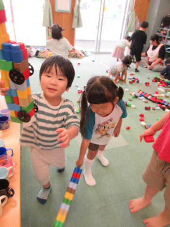 「これは、大きなじどうしゃ。いっぱいつなげたよ」お部屋中、子どもたちのつぶやきで一杯いっぱいになります。