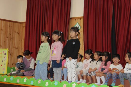 遊戯室の特設ステージに立ってみんな堂々と演じています。