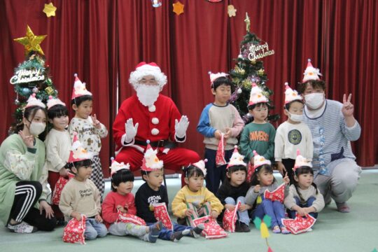 2025.12.25 サンタがやってきた みややま保育園に今年もサンタさんが来てくれました。 一人一人プレゼントをいただいて写真撮影をしました。 写真は、うさぎ組さんです。サンタさんに「ありがとう」をちゃんと言えていました。