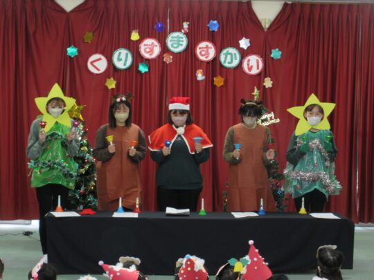 先生たちも、トナカイや星になってハンドベルを演奏。