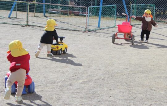 手押し車で進むのは、0歳児ひよこ組のお友だち。