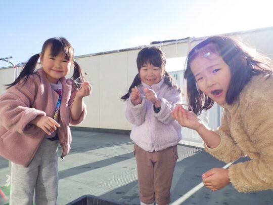 この冬初めての氷に、みんな手を真っ赤にして大はしゃぎでした。