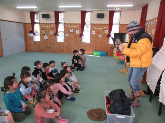 2026.01.25 ハッピーチルドレン 2 今月のテーマは、冬の服装。 コートや、靴下、帽子など、英語での言い方に親しみました。 ルールをしっかり聞いて、この後ゲームで楽しみました。 写真はぱんだ組さんです。お話に集中しています。