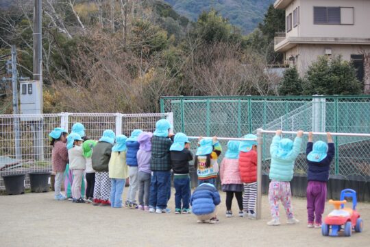 うさぎ組さんに小さいお友だちも混じって、みんな前を向いたり、目隠ししたり。
