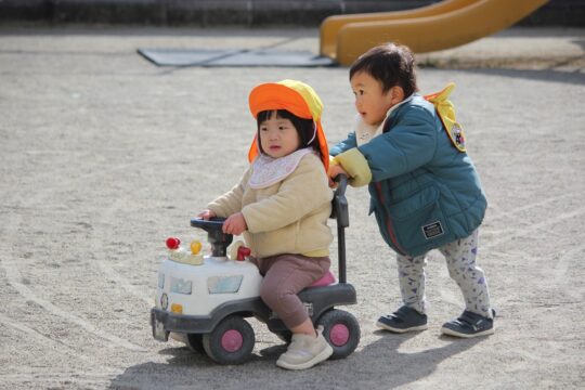 手押し車に乗ったお友だち、後ろからおしてくれるお友だち。
