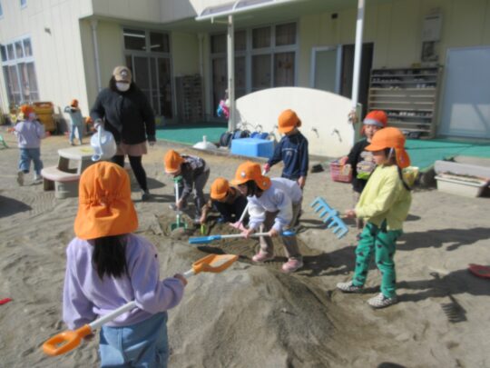 きりん組の子どもたちが、力を合わせて山づくり。