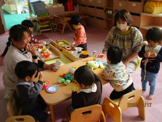 2026.02.17 ごっこあそびで やりとり 大きくなったひよこ組さん。 いつも間にか、大人の仕草を真似て、お料理したり、お人形をおんぶしたり、ミルクだって飲ませてあげるんです。 ごっこあそびをしながら、先生やお友だちとのやりとりも楽しめるようになってきました。