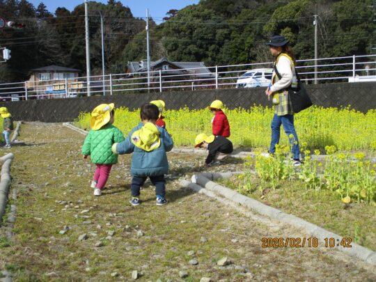 2026.02.18 菜の花畑まで 0歳児ひよこ組さんが、おさんぽ車に乗ってお出かけです。 目指すは、まちづくりの会さんの菜の花畑。 きれいな花の小道を元気に歩きまわる子どもたち。 春は、すぐそこまで来ています。
