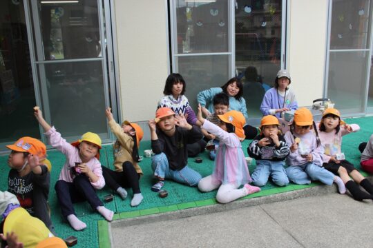 きりん組さんは、1階のテラスでおやつを食べました。