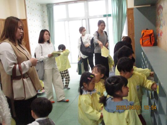 2026.04.1 進級式 1 進級式は、各クラスで行いました。 写真は、4歳児ぱんだ組さんです。 お家の方に見守られながら、自分の荷物をローカーに入れています。 何でも、自分でできるようになりました。 楽しみな年中さんです。