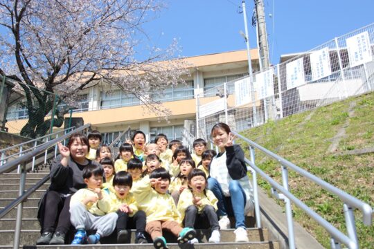今日は、小学校の桜の下で、集合写真を撮りました。